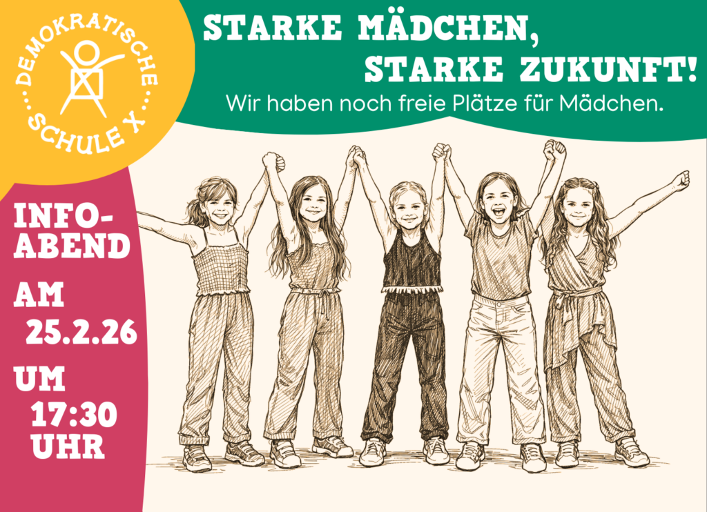 Am 25. Februar um 17:30 Uhr laden wir alle Mädchen und ihre Eltern ein, unsere Schule kennenzulernen, eine Einführung in unser Konzept zu erhalten und Fragen zu stellen. Wir freuen uns sowohl über Interessentinnen für die 1. Klasse als auch über Quereinsteigerinnen.